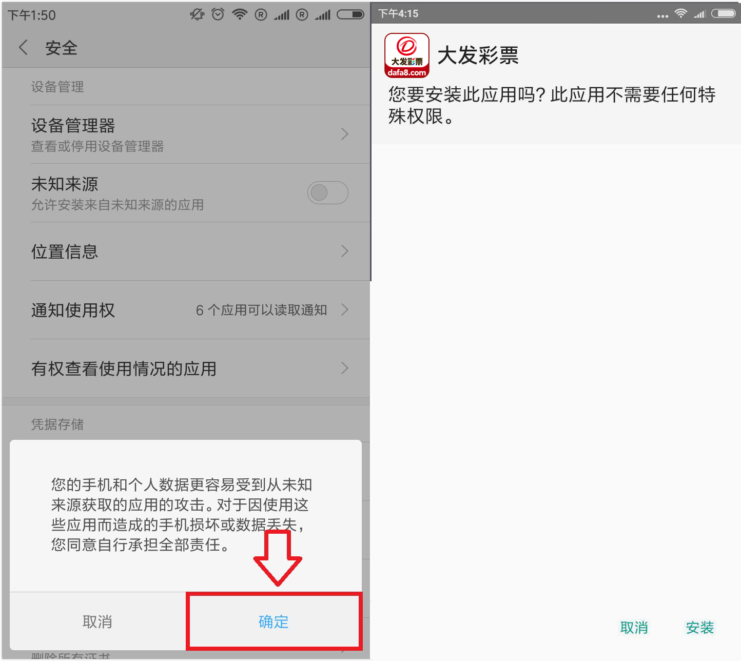 1. 手机访问dafa8.com 点击安卓版本下载, 浏览器会自动下载, 有些品牌手机会提示"禁止安装来源不明的应用", 点击设置