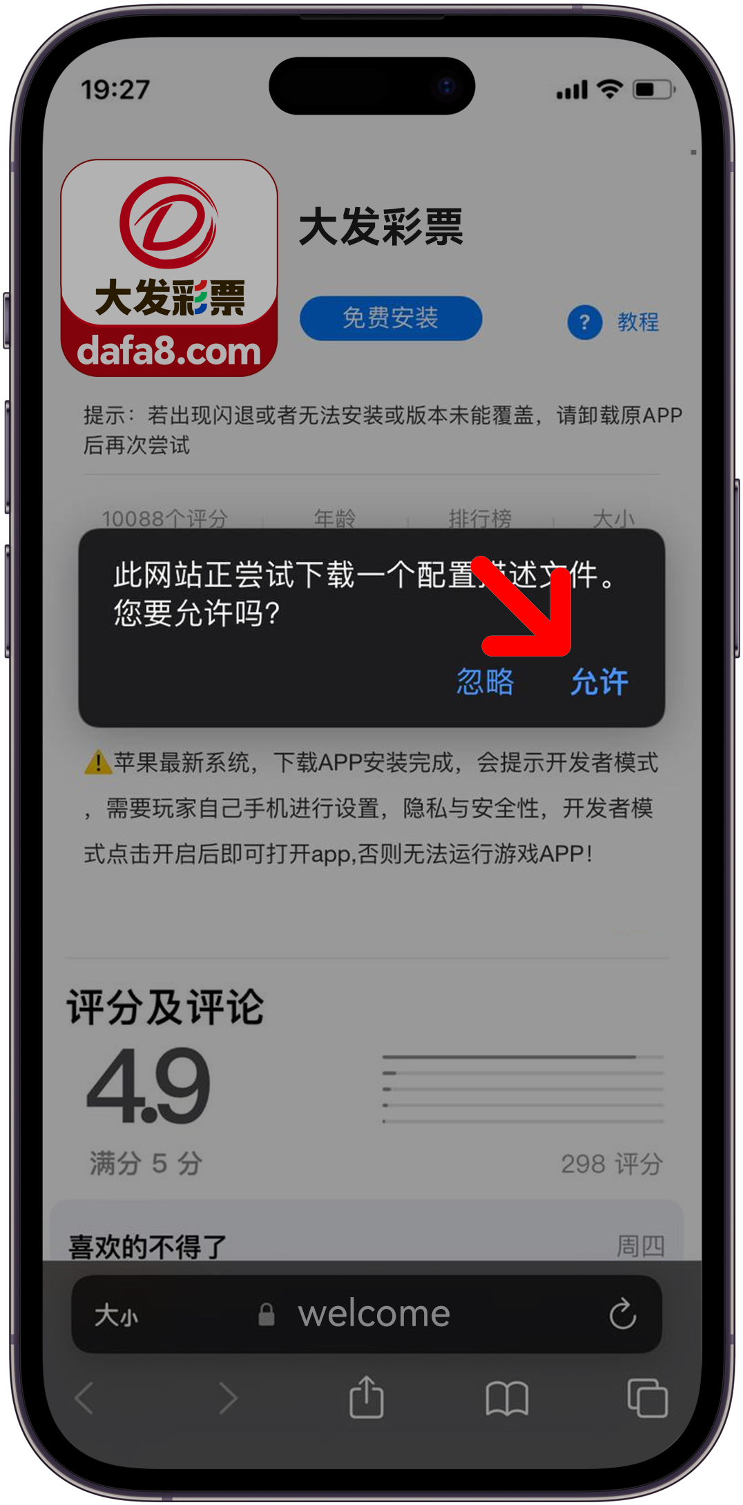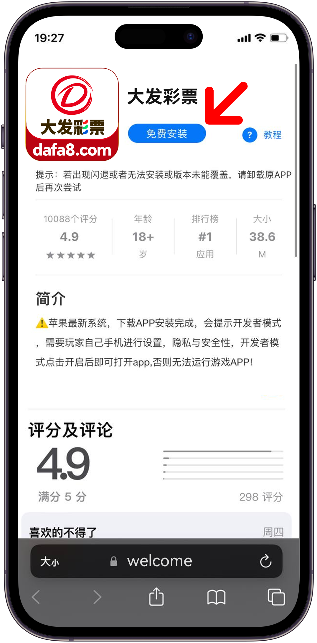 1. 手机访问dafa8.com, 点击苹果版本下载, 在新窗口点击"免费安装" (如上图所示)