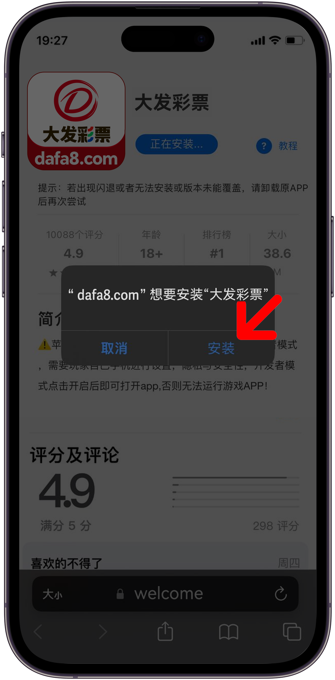 9. 点击弹窗上的"安装", 等待安装完成之后, 返回桌面, 即可正常打开"大发彩票"APP